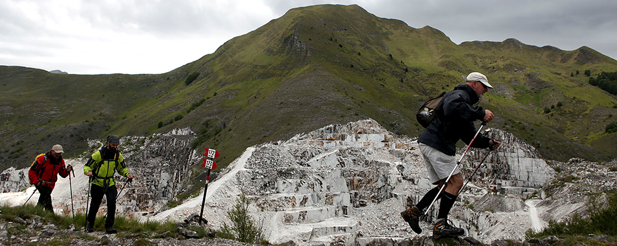 Sfumata la vista mare, il panorama si apre in tutta la sua imponenza, siamo di fronte a cose mai viste, ammirazione e sgomento sono le prime sensazioni che si provano a guardare i monumentali bacini estrattivi situati sopra la città di Carrara. Ora non è più l’azzurro del mare a dominare la scena, ma il bianco marmoreo dei ravaneti, un tempo faro per i marinai, e l’escavazione praticata sui fianchi della montagna. È su queste montagne che Michelangelo nel 1518 venne per estrarre i marmi per i suoi capolavori. Guardando ancora più lontano si stagliano verso il cielo le possenti vette delle Apuane, quasi a volerlo graffiare: il monte Sagro, la nostra meta, le vette del Maggiore, del Grondilice e della Tambura, ricordata da Dante nella Divina Commedia con il nome Tambernicchi, e a chiudere la nostra visuale il monte Sella e la Brugiana, modesta montagna di circa 1000 metri.